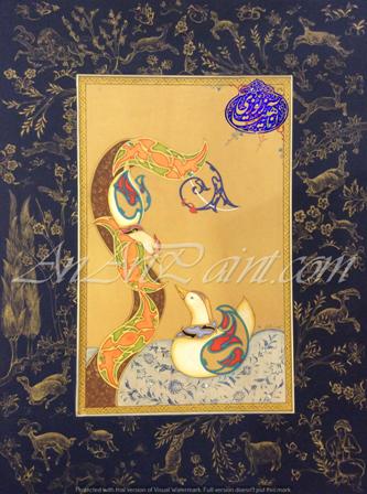 توضیح : اردکهای ماندارین سمبل عشق در اعتقادات مردم در خاور دور می باشد و در علم فنگ شویی از این سمبل استفاده می شود .در آن زمان که با این سمبل آشنا شدم خیلی مایل به تلفیق آن با هنر ایرانی شدم . و این طرح بوجود آمد . در این طرح نقوش اسلیمی و گلهای ختایی تذهیب دیده می شوند . در ضمن در پاسپارتو از تشعیر استفاده شده است .