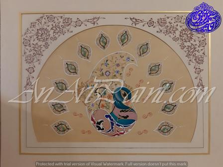توضیح : سمبل دیگری از خاور دور . انرژی یین و یانگ . این دو نشان دهنده قطب های مخالف و تضادهای جهان هستند . وقتی در دنیا احساس خوبی بوجود میاید که تعادل بین یین و یانگ برقرار باشد . در این طرح نیز از گلهای ختایی در تذهیب و گل و مرغ استفاده شده است . از پاسپارتو که دور نقاشی را احاطه کرده و به شکل بته جغه می باشد استفاده شده است که به رنگ سبز سدری می باشد . از سر بته جغه دو نشان آویزان شده اند که با خط طلایی که با ترلینگ رسم شده ، به هم وصل شده اند .