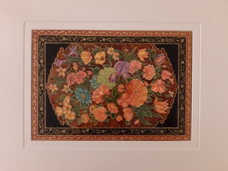 در این اثر فقط یک نمونه گل و با تک رنگ می باشد و با روش پرداز نقاشی شده است . در چهار طرف گل و پروانه از المانهای تذهیب بصورت چلیپا استفاده شده است.